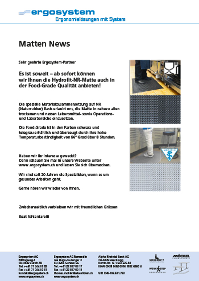 Newsletter Hydrofit-NR-Matten in Food-Grade-Qualität Ab sofort in den Farben schwarz und telegrau erhältlich |